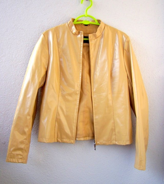 Rewelacyjny żakiecik/kurteczka w kolorze beżu, materiałem imitujący skórę lakierowaną, zapinany na suwak, na podszewce. Stan idealny.Fason- delikatnie rozkloszowany.