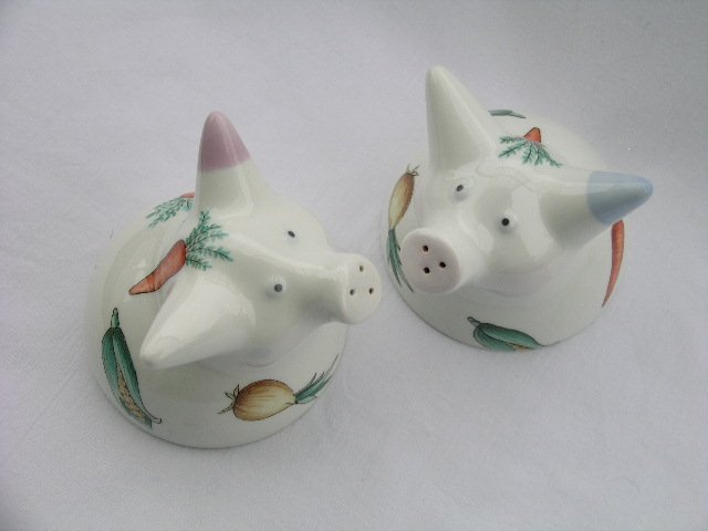 Fantastyczne, dowcipne i świetnie wykonane przyprawniki, sygnowane jakością Villeroy & Boch. Seria warzywna. Błyszczące szkliwienie; od spodu plastikowe zatyczki. Solniczkę ktoś zbyt dynamicznie odstawił na twardej powierzchni - bez zagrożeń i ubytku w użytkowości odprysk, z zewnątrz niewidoczny. Dekoracja i użytkowość z uśmiechem :) 7 x 8,5 x 7 cm. Stan zachowania bardzo dobry i dobry.