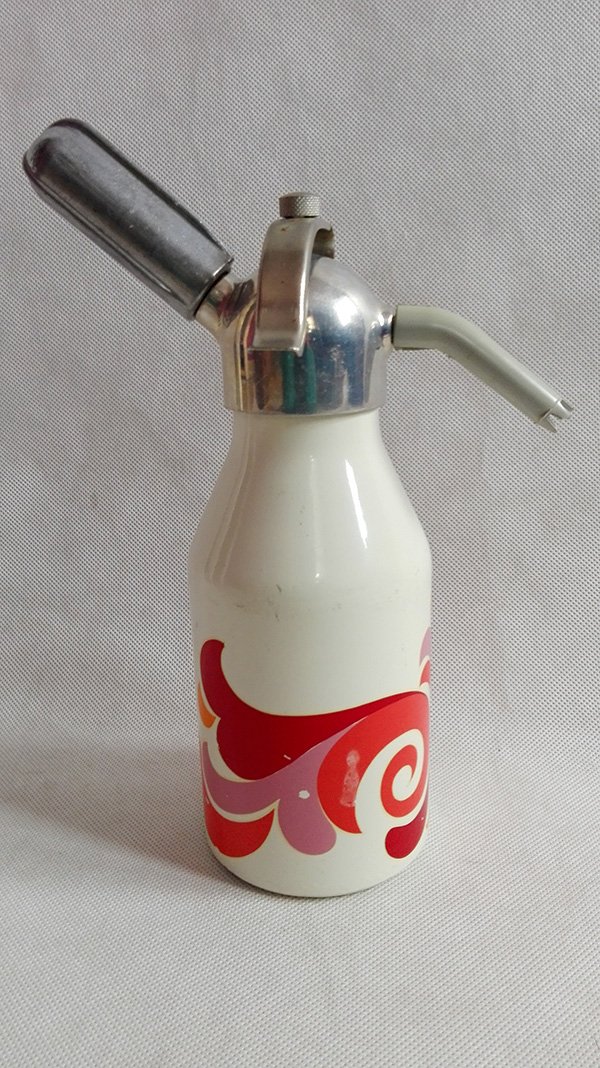 Syfon do bitej śmietany, metalowy ozdobiony nadrukiem [ lat a70-te]. Gumowa nakładana rurka. Odkręcany pojemnik na naboje.