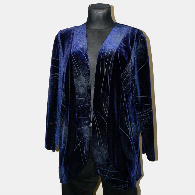 Piękna welurowa narzutka żakiet bez zapięcia, głęboki chabrowy granat z delikatnym wzorem róż i kreseczek. Miejscami zdobiony dodatkowo maleńkimi drobinkami brokatu. Niezwykle elegancki. Bez usztywnień na ramionach.