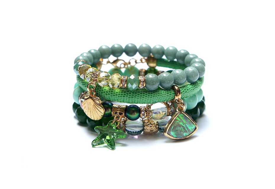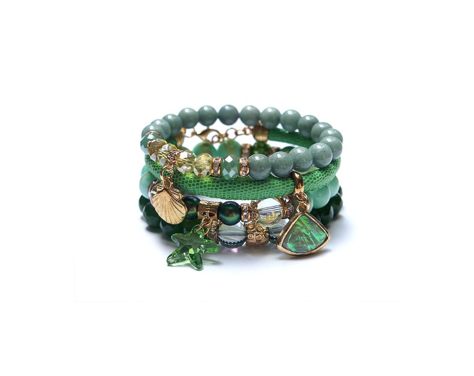 Komplet czterech bransoletek wykonanych z naturalnych kamieni: jadeit faetowany [10mm], jadeit platerowany [10mm], jadeity [8mm],perły Swarovski [8mm], szklane kuleczki [10mm], kwarc [10mm] ,kryształki [8mm] ,kuleczki shamballa wysadzanej cyrkoniami [10mm] , zawieszki z kryształka Swarovski ,rzemienia z naturalnej skórki [6mm] oraz elementów metalowych w kolorze złota. Bransoletki pasują na nadgarstek 16 - 17cm. Biżuteria ozdobnie zapakowana