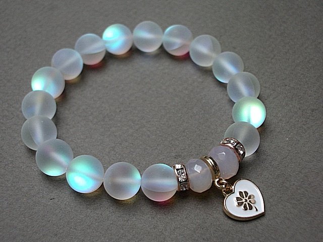 PROJEKTY AUTORSKIE. WŁASNOŚĆ KI-KA. KOPIOWANIE ZABRONIONE, Bransoletka wykonana z kwarcu matowego z efektem mystic [10mm], oponek kwarcu [10 x 8mm] oraz elementów metalowych kolorze tzw. różowego złota. Bransoletka na gumce silikonowej. Będzie pasowała na nadgarstek 16-17cm. Biżuteria ozdobnie zapakowana.