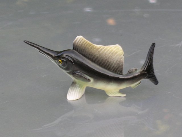 Figurka z cieniutkiej porcelany, ręcznie malowana, na satynowo szkliwiona. Bardzo filigranowa. 9 x 3 x 4 cm. Stan zachowania dobry - dolna płetwka ogonowa z uszczerbkiem, podmalowana, nie bardzo widoczna.