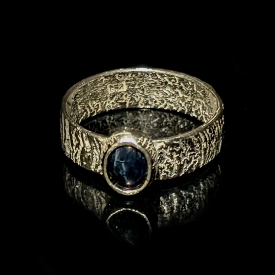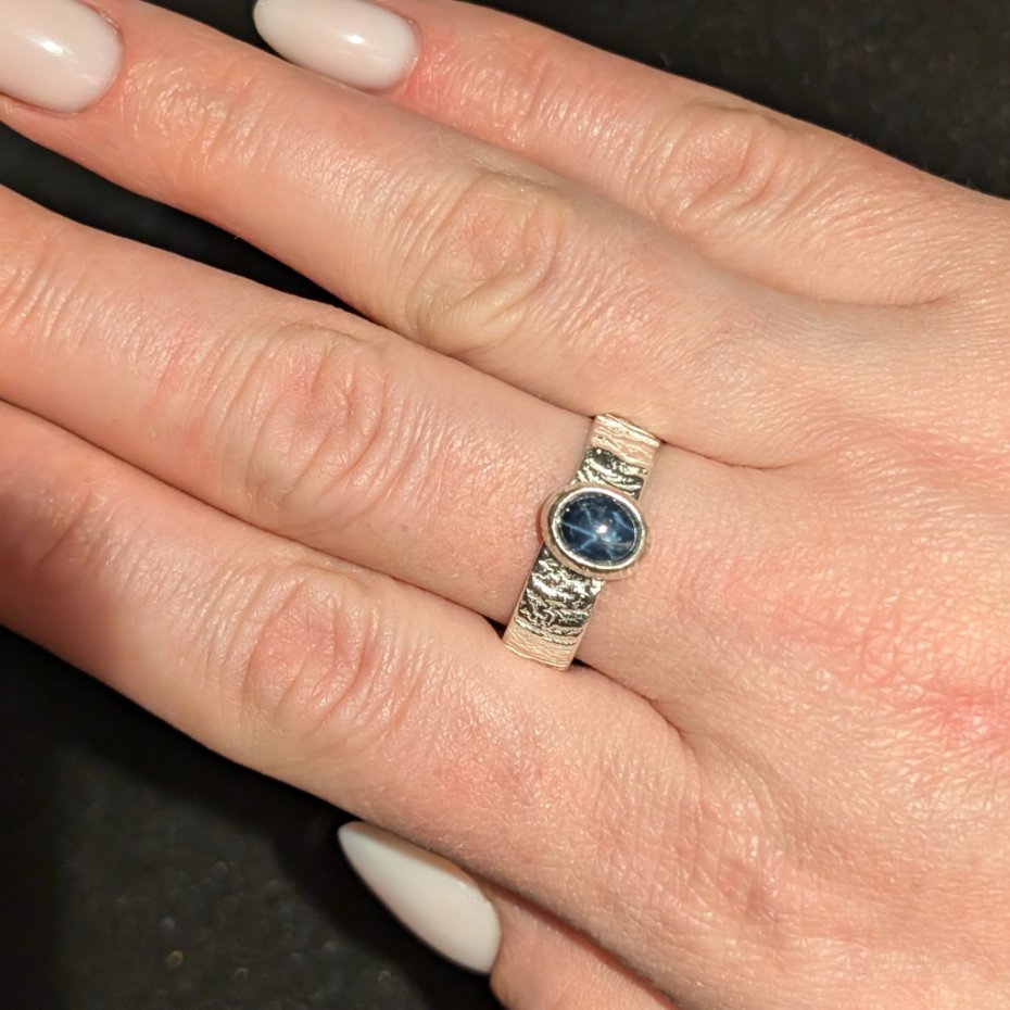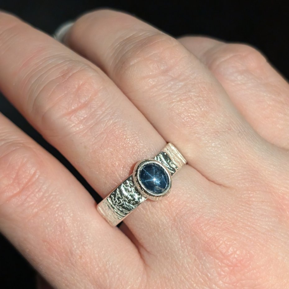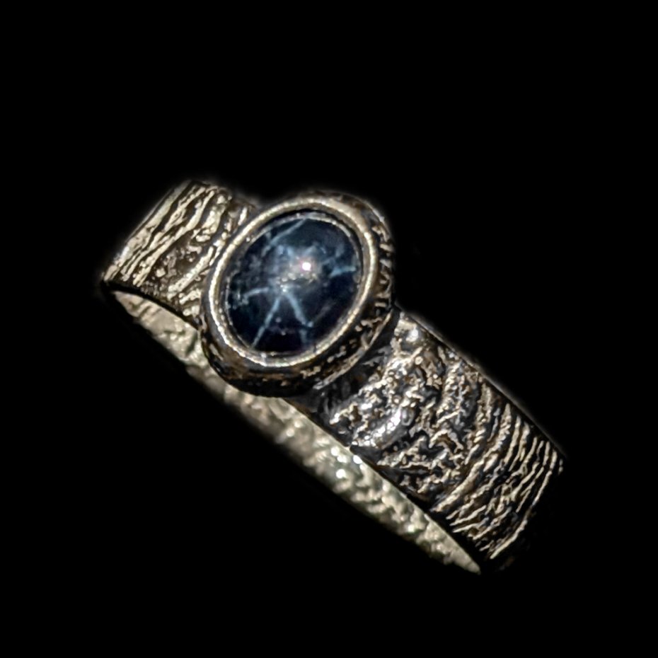 Pierścień z pięknym szafirem gwiaździstym w oprawie srebra próby 925. Szafir z gwiazdą sześcioramienną (zjawisko asteryzmu widoczne w nierozproszonym świetle,porusza się wraz ze źródłem światła). Kamień dyfuzjowany. Wymiary kamienia oprawy kamienia 9 x 7mm, rozmiar jubilerski 23. Waga 4,7 grama. Pierścionek zostanie zapakowany w ozdobne pudełeczko.