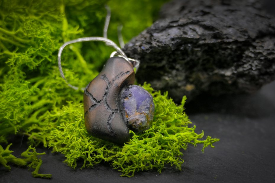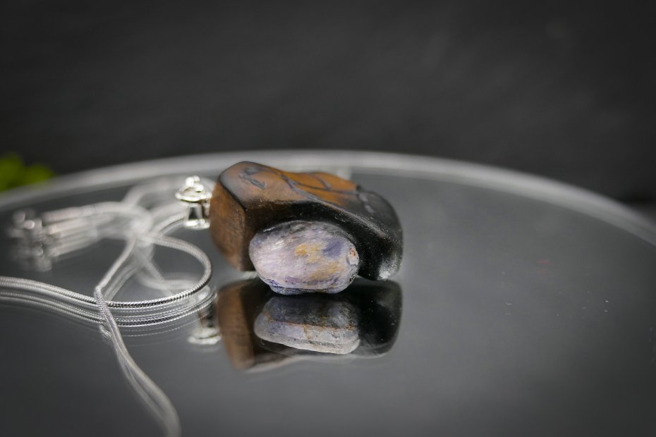 Centralnym elementem jest surowy SZAFIR osadzony w drewnie.