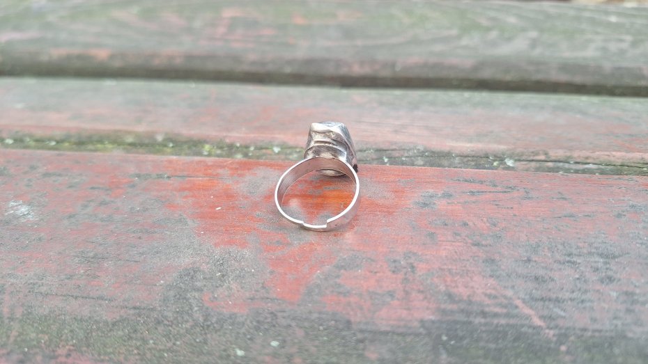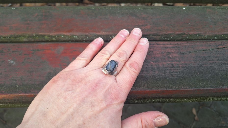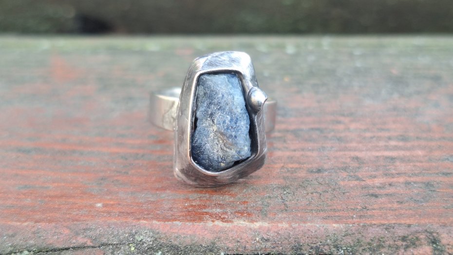 Pierścionek wykonany z miedzi, cyny i surowego szafiru. Wymiary ok. 1.5 na 1 cm. Regulowany. Nie jest ciężki.