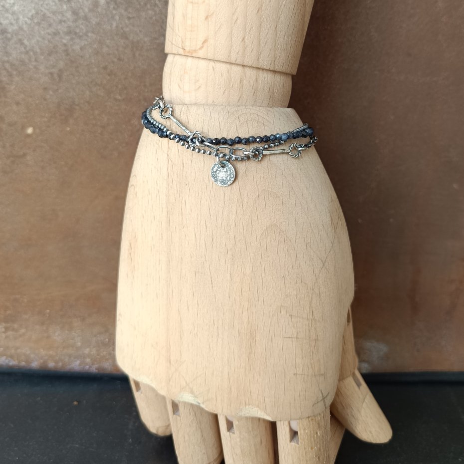 Bransoletka powstała z połączenia srebra z naturalnymi minerałami - kuleczkami drobnych szafirów.