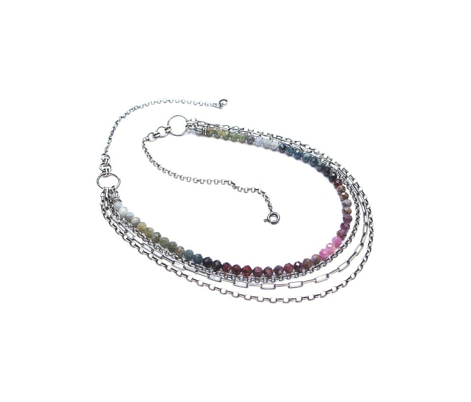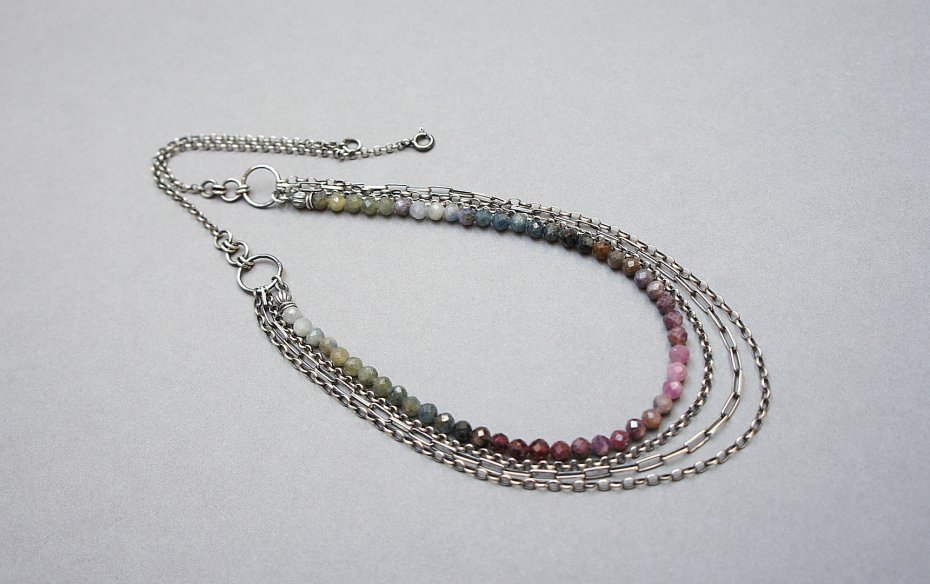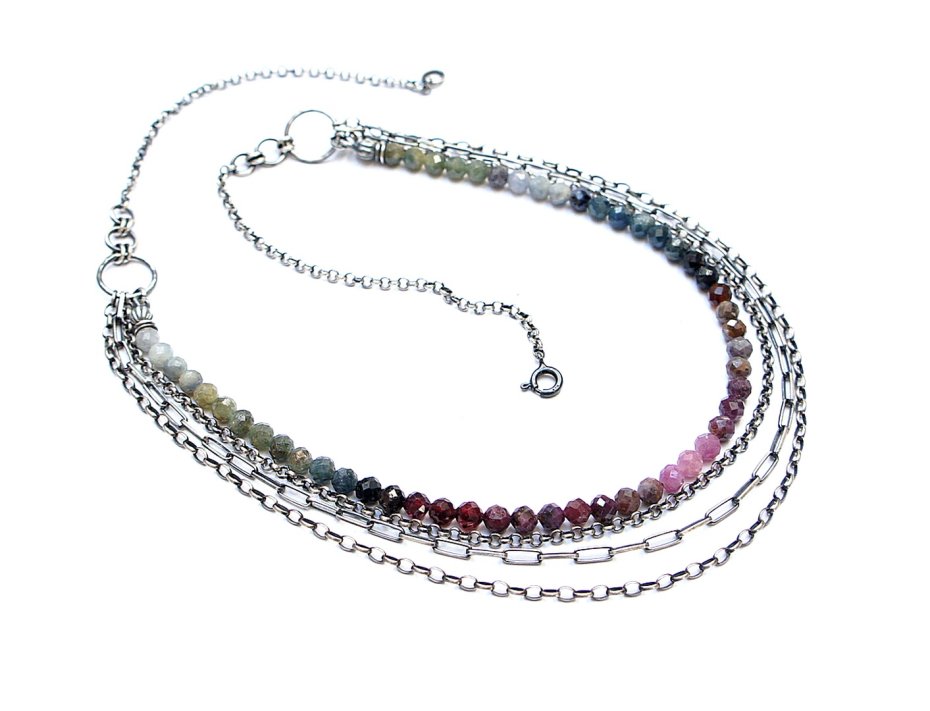 Naszyjnik wykonany ze srebra [pr. 925] w połączeniu z fasetowanymi kuleczkami naturalnych szafirów [4mm - mix kolorów] oraz łańcuszkami. Całość oksydowana i przetarta. Długość naszyjnika po najkrótszym obwodzie 44,5cm. Biżuteria ozdobnie zapakowana.