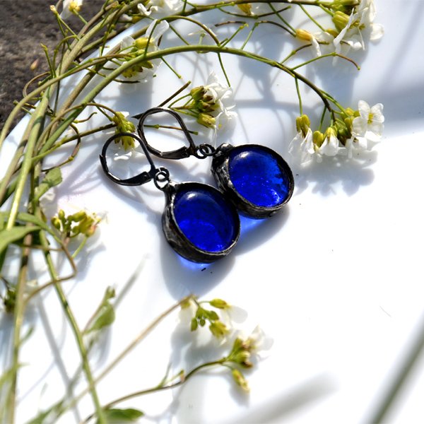 Niewielkie, delikatne kolczyki ze stapianymi szkiełkami w głębokim kolorze. Rustykalna ozdobna oprawa w kolorze starego srebra wykonana z miedzi pokrytej ekologiczna cyną. Długość całego kolczyka to ok. 3,7 cm. Biżuteria w 100% wykonana ręcznie, poszczególne sztuki mogą się minimalnie różnić.