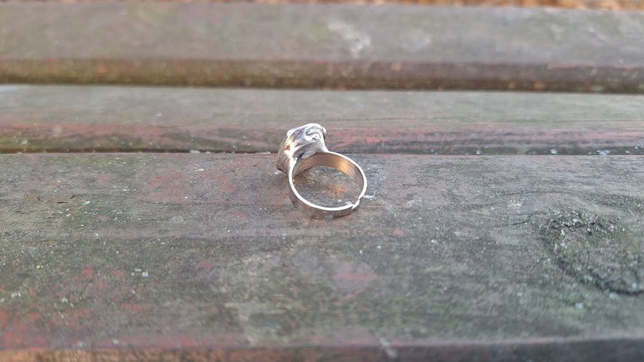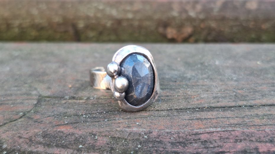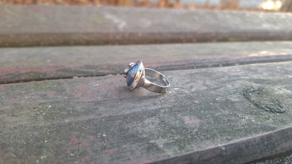 Pierścionek wykonany z miedzi, cyny i surowego szafiru. Wymiary ok. 1.5 na 1.2 cm. Regulowany. Nie jest ciężki.