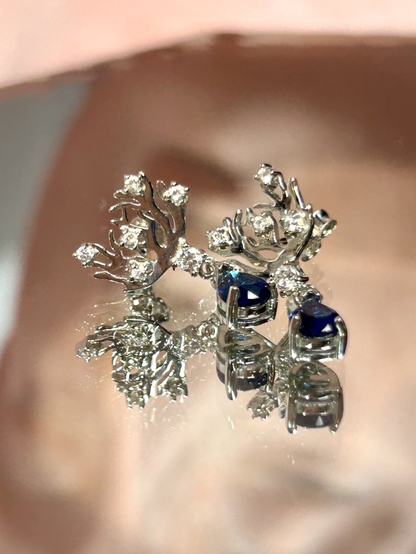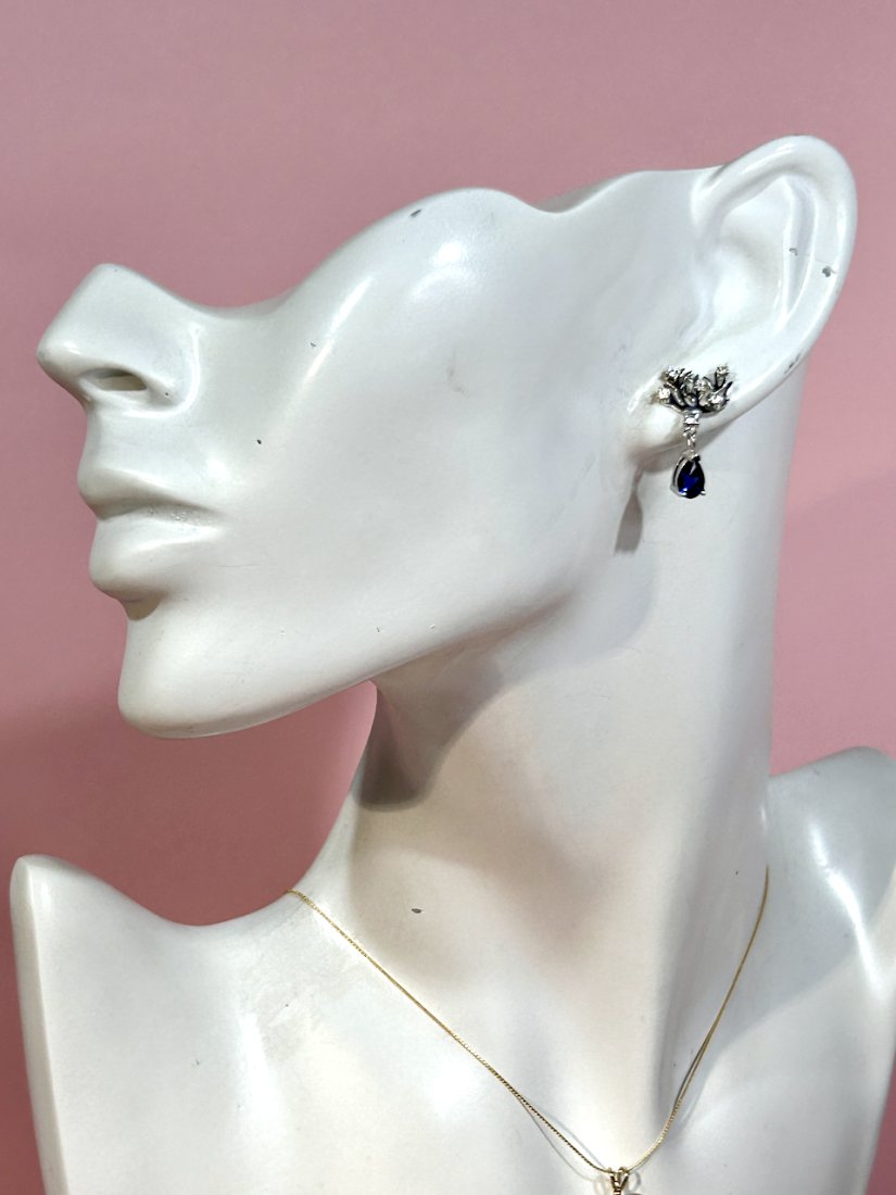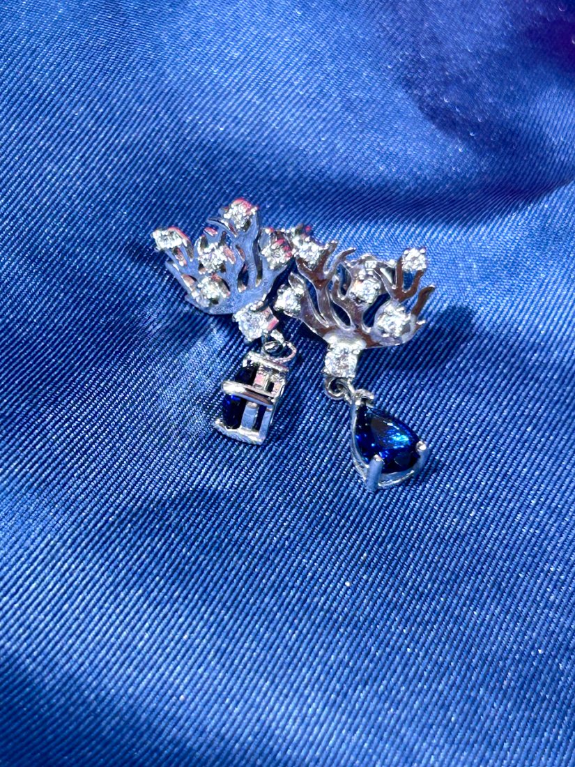 Na górze są takie gałązki jak koralowiec, wysadzane drobnymi, lśniącymi cyrkoniami a na dole zawieszona kropla z szafirową cyrkonią w eleganckim szatonie.