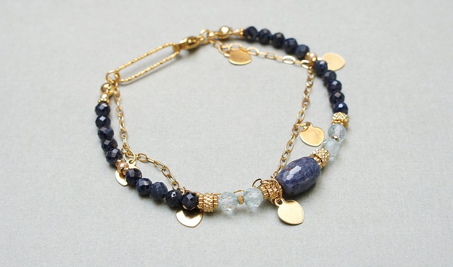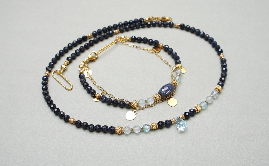 Delikatna bransoletka wykonana w całości z pozłacanej stali szlachetnej oraz naturalnych, szlachetnych kamieni - fasetowanych szafirów [4mm], fasetowanych niebieskich topazów [4mm], fasetowanej oliwki szafiru [11 x 7mm], fasetowanych, platerowanych hematytów [2mm i 3mm], przekładek z hematytów [1mm]. Całkowita długość bransoletki: 18,7mm (możemy dopasować na inny nadgarstek - wcześniej prosimy o kontakt). Do kompletu można dokupić naszyjnik przedstawiony na zdjęciach. Biżuteria ozdobnie zapakowana.