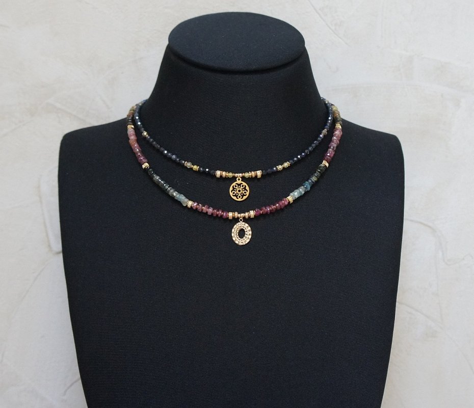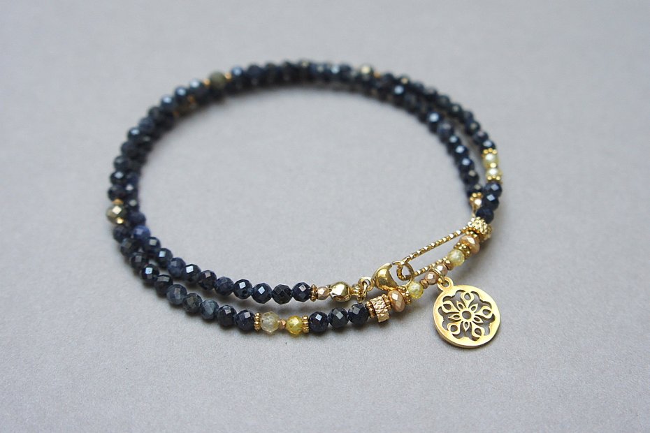 Krótki, delikatny naszyjnik wykonany w całości z pozłacanej stali szlachetnej oraz naturalnych, szlachetnych kamieni - szafiry fasetowane [3mm], piryt fasetowany [4mm], cyrkonie fasetowane [3mm], oponki hematytu platerowanego [4 x 2mm], przekładek z hematytu [1mm, 2mm]. Naszyjnik o długości 42,5cm.