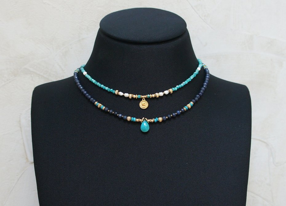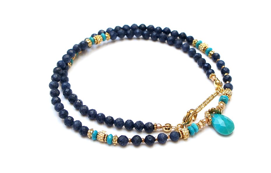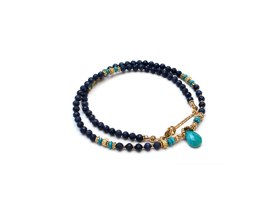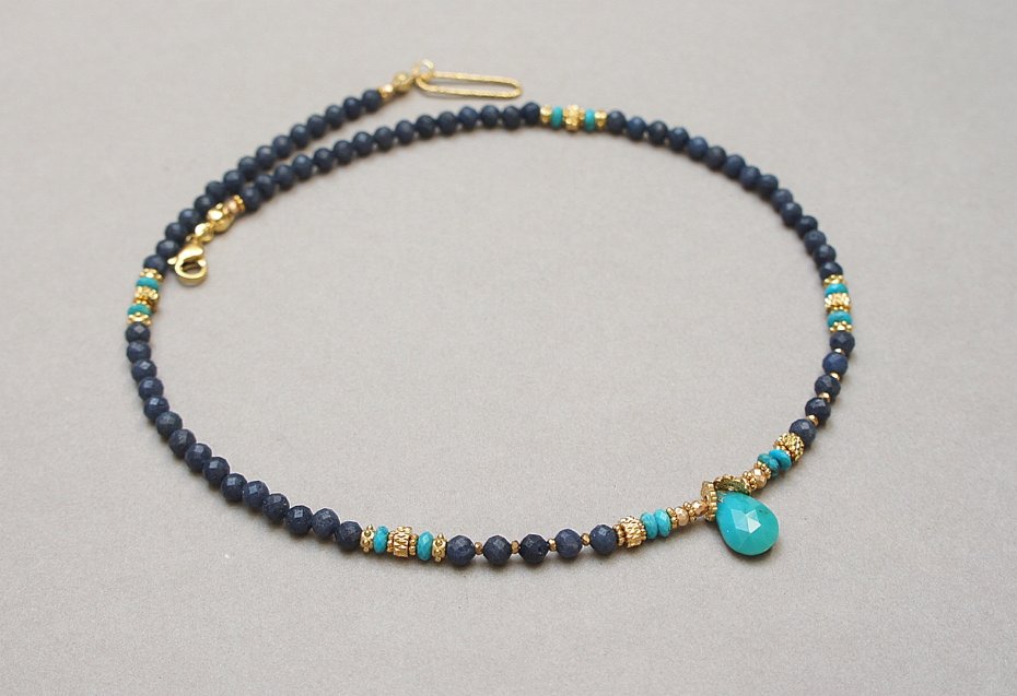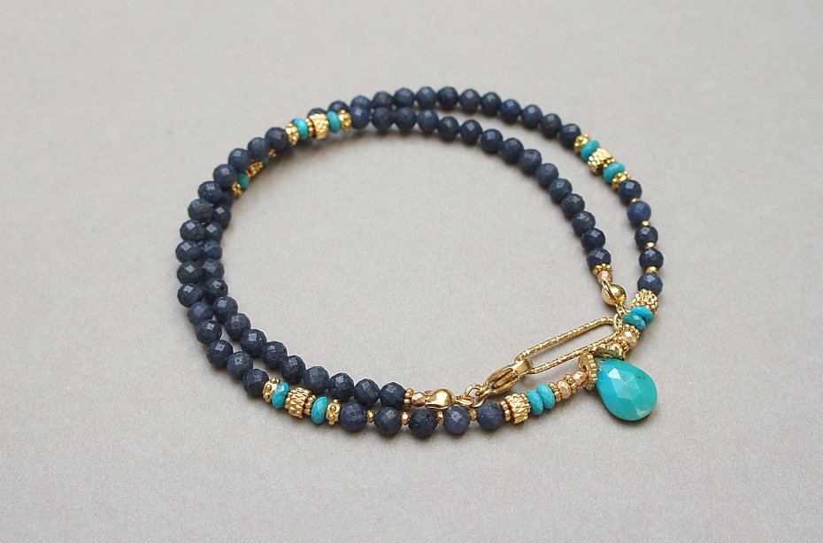 Krótki, delikatny naszyjnik wykonany w całości z pozłacanej stali szlachetnej oraz naturalnych, szlachetnych kamieni - szafiry fasetowane, matowe [3mm], turkus fasetowany beauty [oponki ok. 4 x2mm], oponki hematytu platerowanego [3 x 2mm], przekładek z hematytu [1mm, 2mm] oraz łezki fasetowanej naturalnego turkusu. Naszyjnik o długości 42cm.