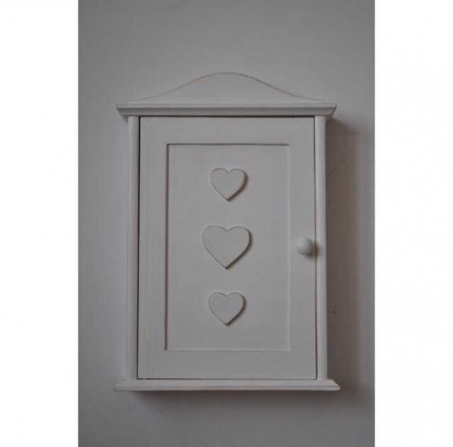 Szafeczka została pomalowana na biało farba akrylową i przetarta na krawędziach. Ozdobiona jest serduszkiem wyciętym z drewnianej sklejki.