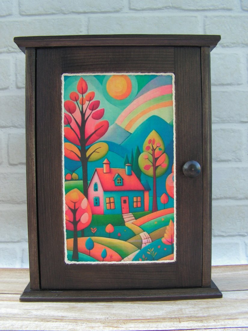 Drewniana, prostokątna szafka na klucze ozdobiona metodą decoupage.