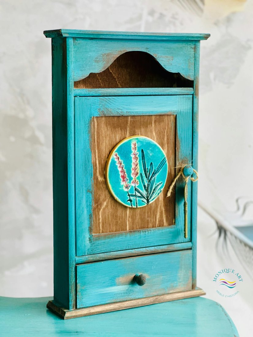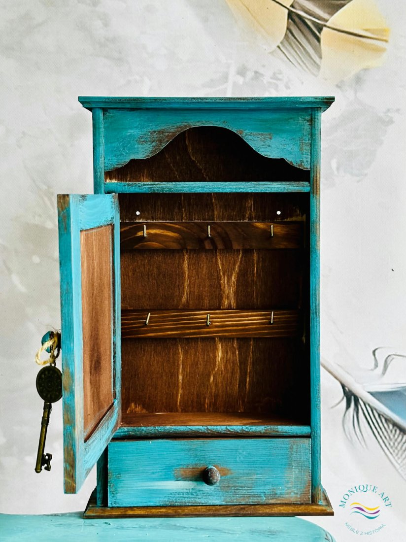 Szafka powstała z drewna sosnowego, ma wymiary: 19,8 cm x 36,5 cm x 5 cm, wewnątrz ma dwa rzędy na klucze i funkcjonalną szufladkę w dolnej części.