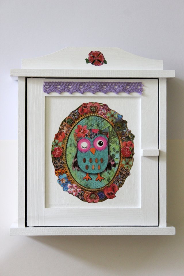 Drewniana szafka na klucze dekorowana metodą decoupage. Zarówno użyta farba (biała akrylowa) jak i lakier są bardzo dobrej jakości (hipoalergiczne).