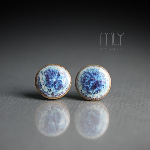Ceramiczne kolczyki w formie sztyftów, ręcznie wykonane z delikatnej kamionki jednostronnie szkliwione błękitnokremowym szkliwem z efektem plamek, na antyalergicznych sztyftach w kolorze srebrnym.Średnica ok. 9mm.Polecam