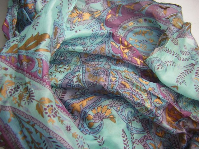 Ciekawy SZAL z jedwabiu. Z metką 100% SILK Made in India. Delikatność wzoru, koloru i materii. Bardzo oryginalnie zdobiony. Niuanse niebieskości i fioletów złotem okraszone. Elegancki, obrębiony . Wygląda na nowy.