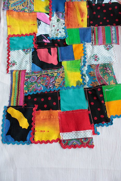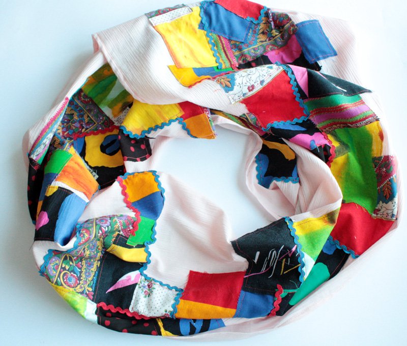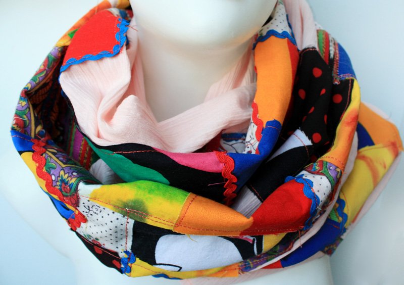 Przedstawiam Państwu luksusowy, absolutnie unikatowy szal zaprojektowany i wykonany przeze mnie w pojedynczym egzemplarzu ze 105 (stu pięciu) różnych nonszalanckich elementów. Każdy z nich jest inny pod względem wzoru, rozmiaru, odcieni, tkaniny, wykończony surowo. Wszystkie przyszywane oddzielnie, z pieczołowitością i całym sercem. Szal jest duży, miękki, można się nim owinąć, otulić, stworzyć niebanalną stylizację. Odpowiedni na każdą porę roku. Tło w odcieniu bardzo jasnego, leciutko karbowanego różu.