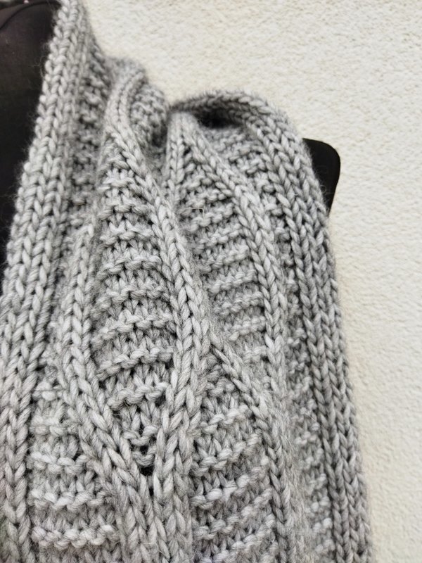 Miły , ciepły szal z akrylowej włóczki w jasnoszarym kolorze z pięknym wzorem . Wykończony frędzlami.