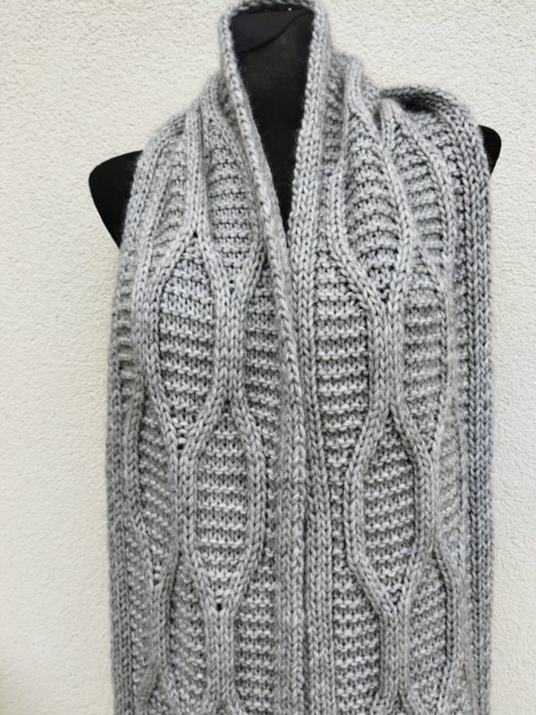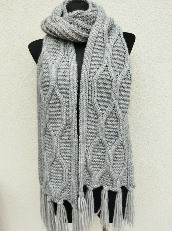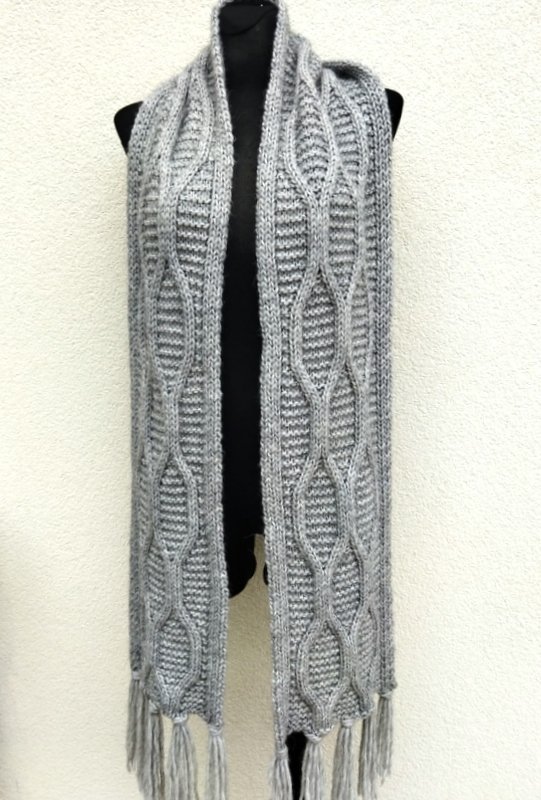 Miły , ciepły szal z akrylowej włóczki w jasnoszarym kolorze z pięknym wzorem . Wykończony frędzlami.