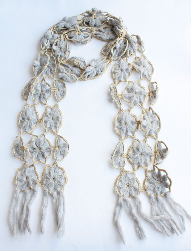 Długi szal wykonany z kilkudziesięciu ażurowych kwiatów.