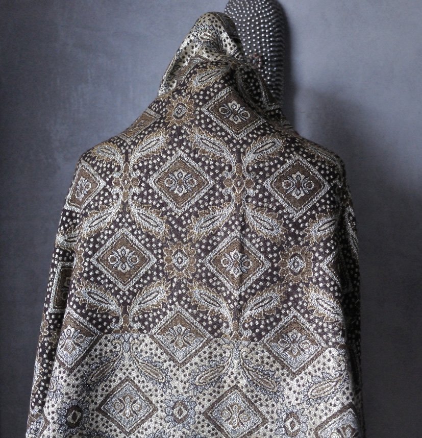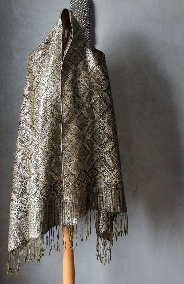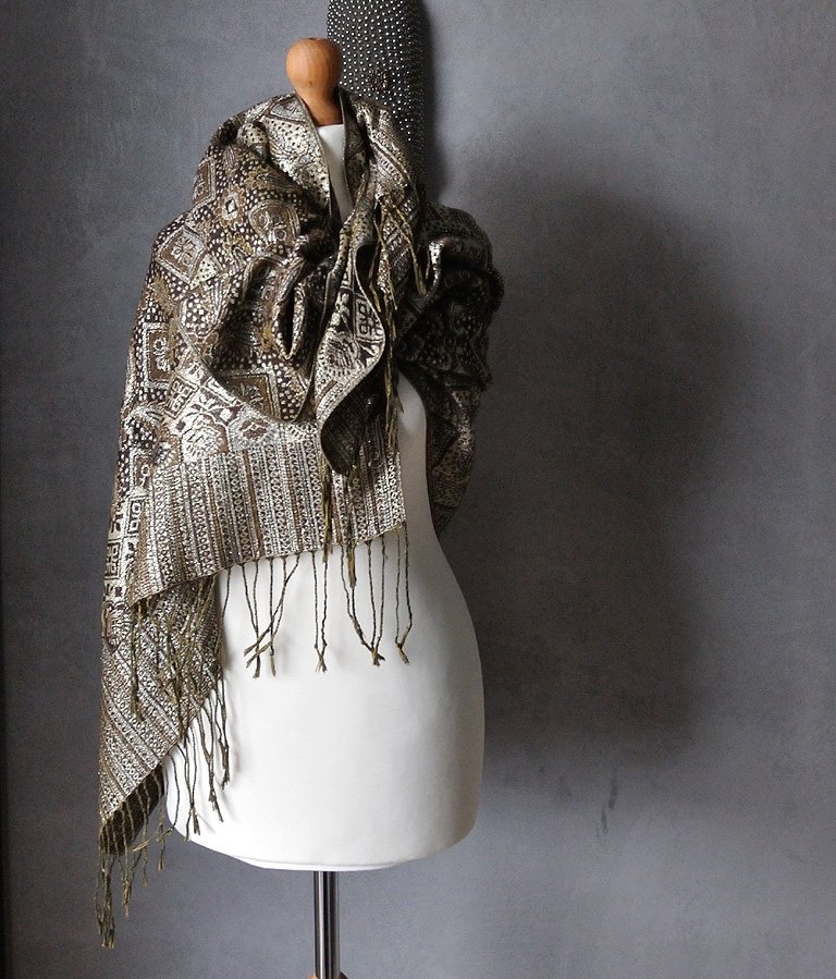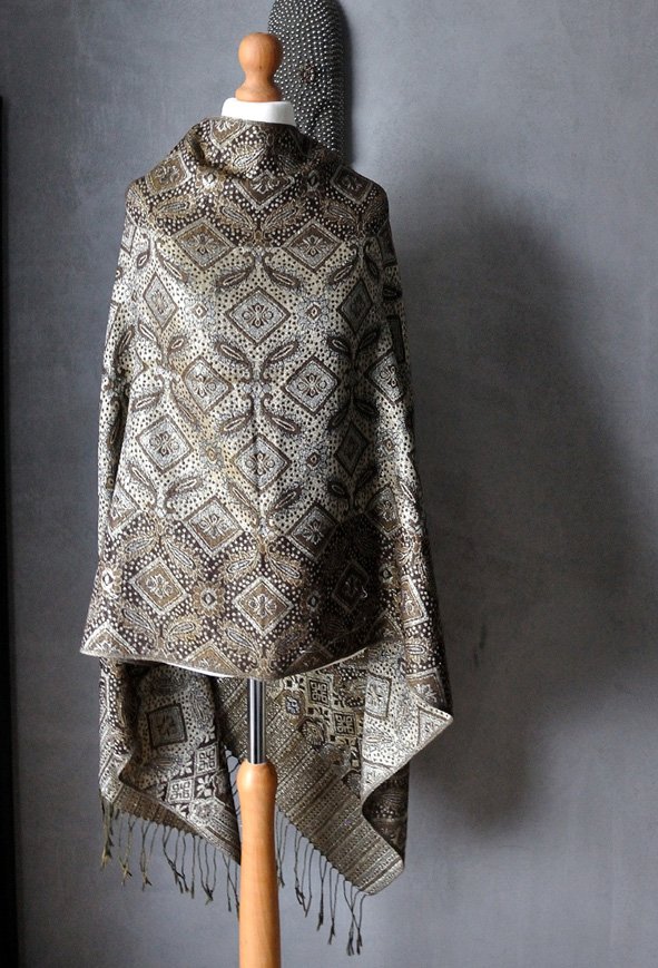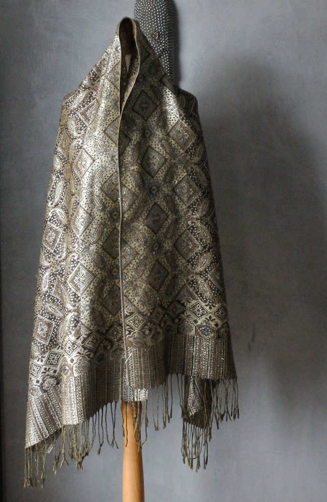 Sporych rozmiarów, lekki, dwustronny szal w odcieniach brązu, antycznego złota, srebra... Bogaty, stylowy, w misterny wzór. Cały szal jest gęsto przetykany metalicznymi nićmi, połysku i mienienia się jest więc dużo. Żakardowy, z bogatym, barokowym wzorem. Materiał nieco sztywniejszy (przez metaliczną nić) ale nadal dobrze i pięknie się nosi.
