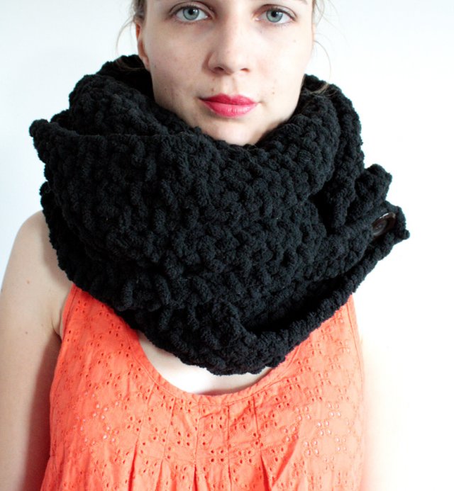 Niezwykle miękkie w dotyku i bardzo praktyczne cudo. Z jednej strony dwa duże guziki, które umożliwiają różnorodność aranżacji. Można nosić na przykład jako etolę lub pelerynkę lub naprawdę gruby, przylegający do szyi, ciepły szal. Materiał to akryl lub wiskoza.