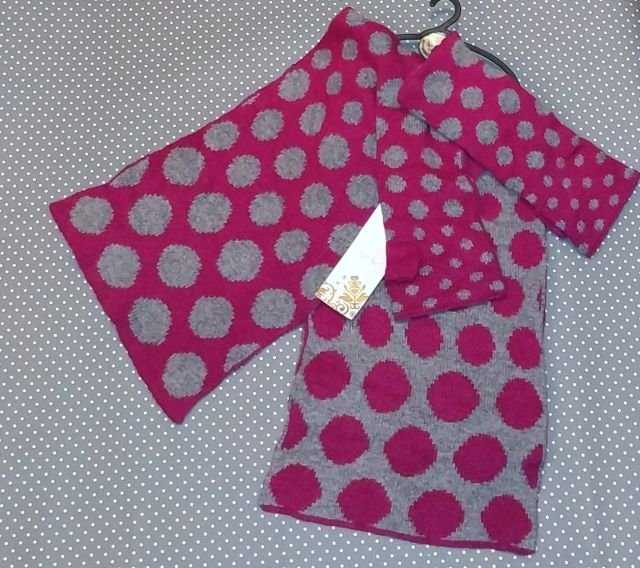 Piękny zestaw kolorystyczny- szarość i ciemny róż.szalik dwustronny, przy końcach kropki są większe.Bardzo twarzowy, polecam.