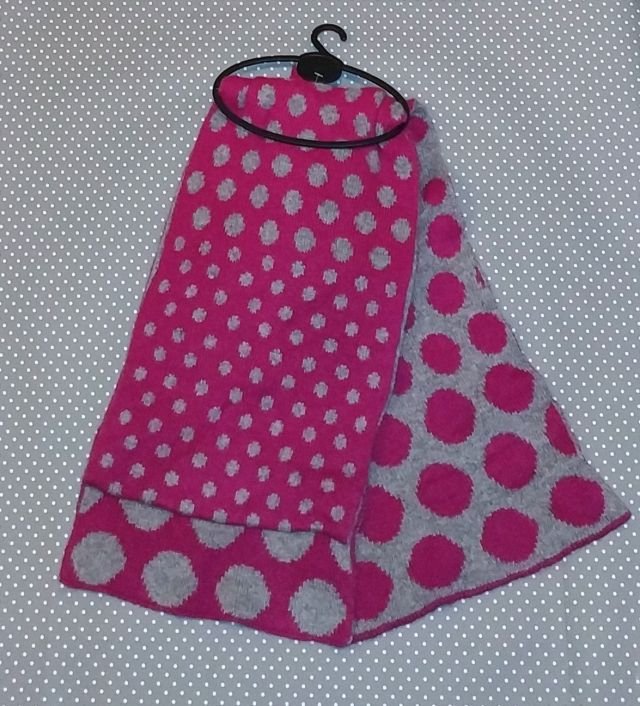 Piękny zestaw kolorystyczny- szarość i ciemny róż.szalik dwustronny, przy końcach kropki są większe.Bardzo twarzowy, polecam.