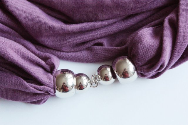 Duży, miękki szal o ciekawie wykończnych brzegach, które można spiąć haczykami. Kolor to ciepł, wrzosowy fiolet.