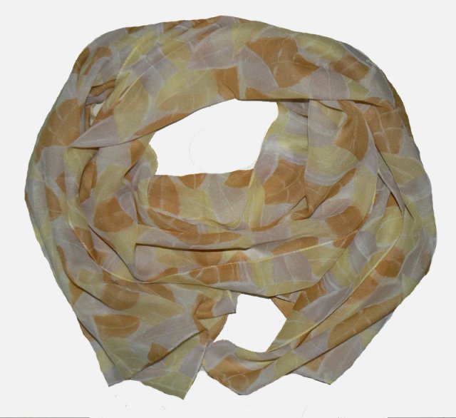 Szal w pastelowych barwach w delikatny wzór liści, odcienie beżu, żółci i pomarańczu.