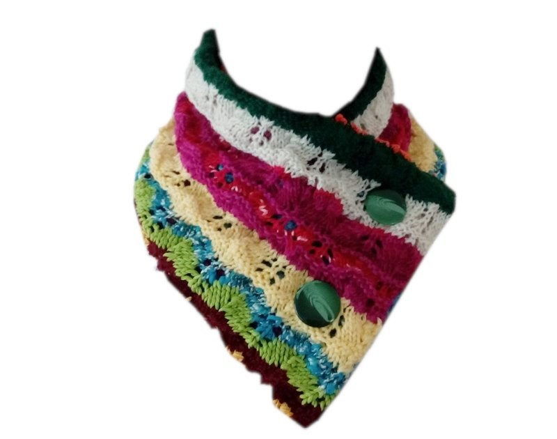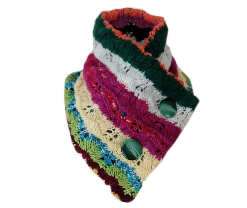 Szal wykonany jest z kolorowych włóczek, dziergany, dwuwarstwowy i bardzo ciepły.