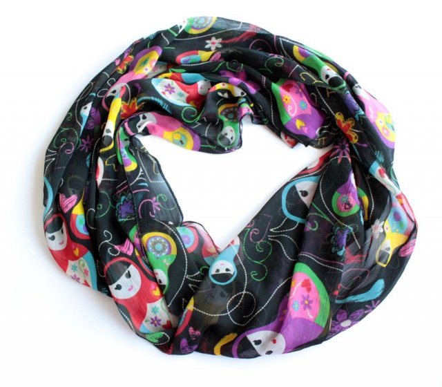 Zwiewny szal w niebanalny wzór - matrioszki. Wesoły dodatek, który urozmaici każdą stylizację.