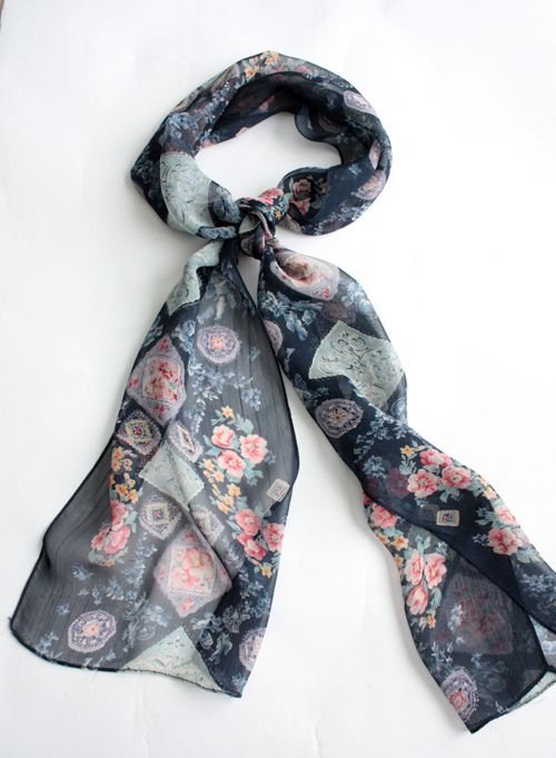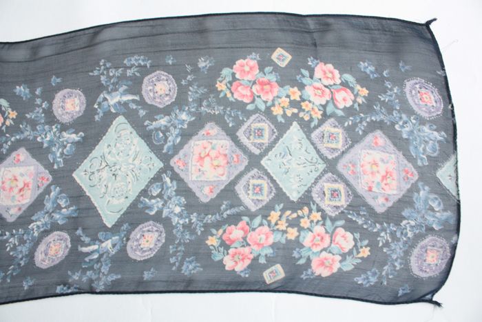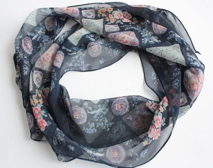 Transparentny zwiewny szal w kwiatowe wzory na granatowym tle. Wykonany prawdopodobnie poliestru.