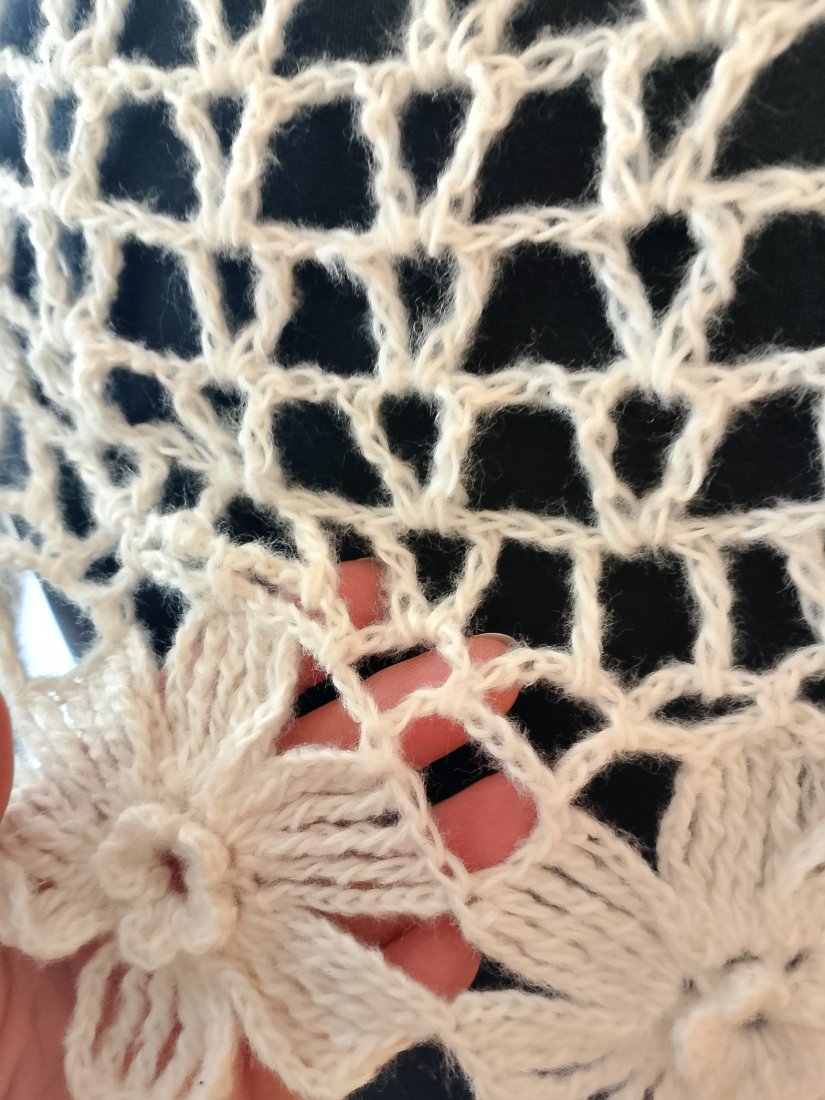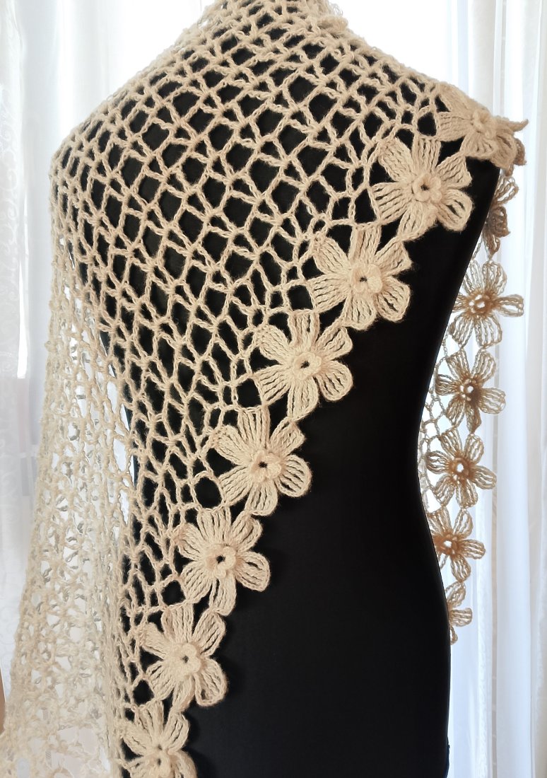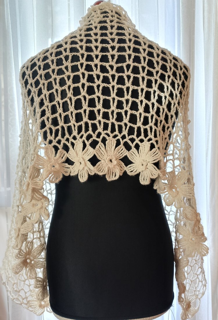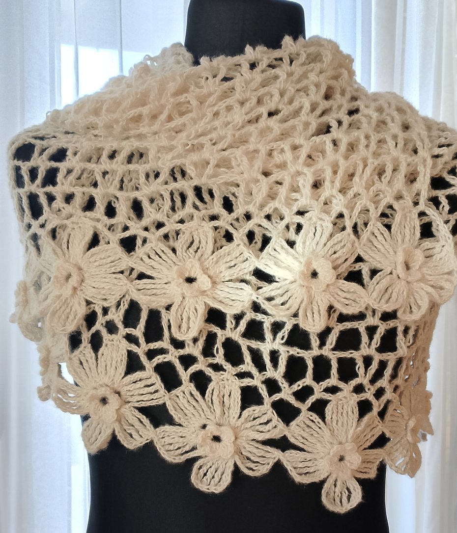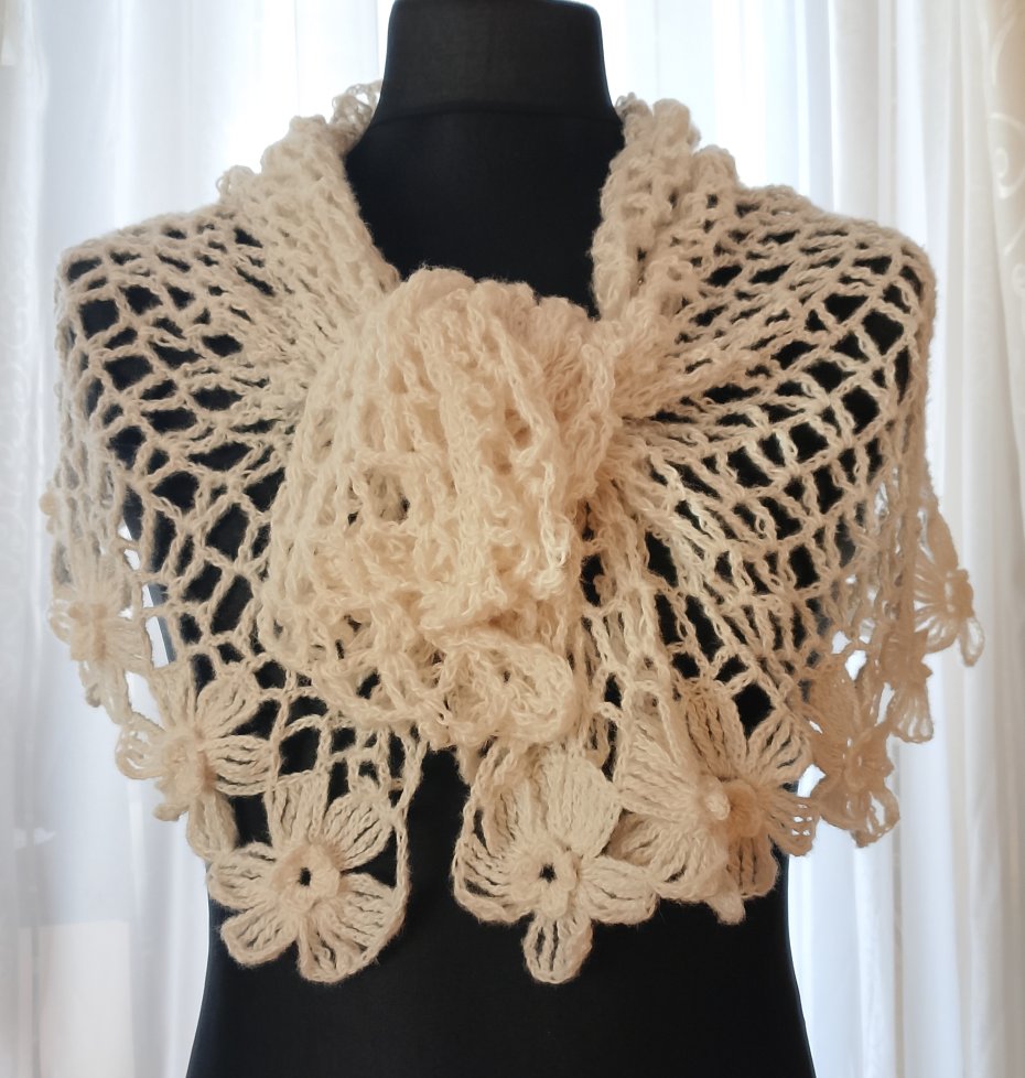 Wyjątkowo piękny szal wykonany w całości ręcznie. Użyto moheru, bardzo delikatnego w dotyku. Szal jest leciutki i ulotny jak mgiełka, a przy tym ciepły. Jest także plastyczny, dzięki czemu można kształtować go na wiele sposobów. Będzie doskonałym dodatkiem ślubnym, wieczorowym lub codziennym.