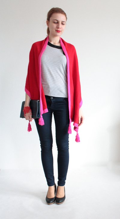 Duży, miękki szal w kolorze czerwonym i różowym. Materiał oceniam na akryl.