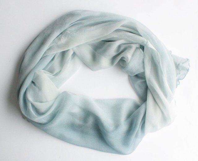 Zwiewny, przepiękny, półtransparentny szal w subtelnie przechodzących odcieniach błękitu. W dotyku przypomina jedwab.