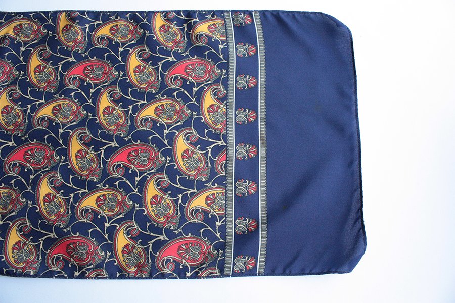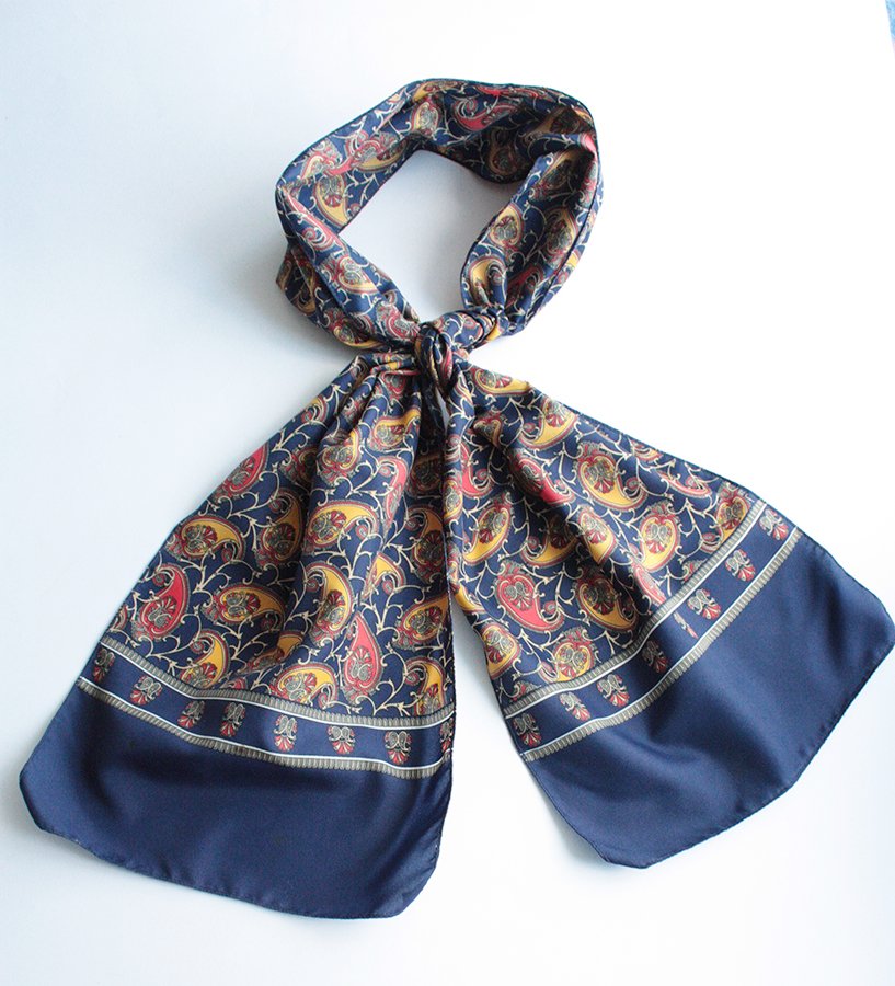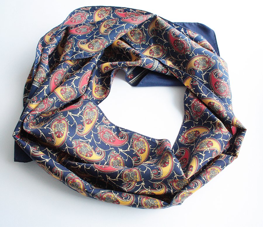 Zwiewny szal we wzory typu paysley na granatowym tle. Wykonany prawdopodobnie z poliestru.