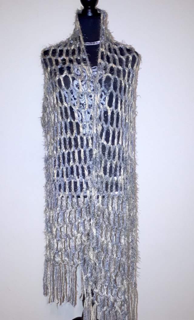 Ażurowy szal o dużych oczkach z grubej włóczki akrylowej w kolorze gołębim i ecru, z wplecionym dłuższym włosem, z frędzlami