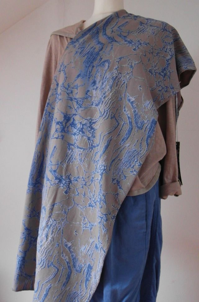 Duży,nowy, bawełniany szal firmy Unisono. Kolor- beżowe tło i chabrowe nieregularne wzry. Z metką.Na żywo ładniejszy niż na zdjęciu, lekko intensywniejsze kolory.Dobry na prezent.