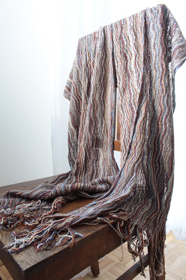 Duży, oryginalny szal o ciekawej, "sznurkowej" fakturze. Szal jest miękki w dotyku.