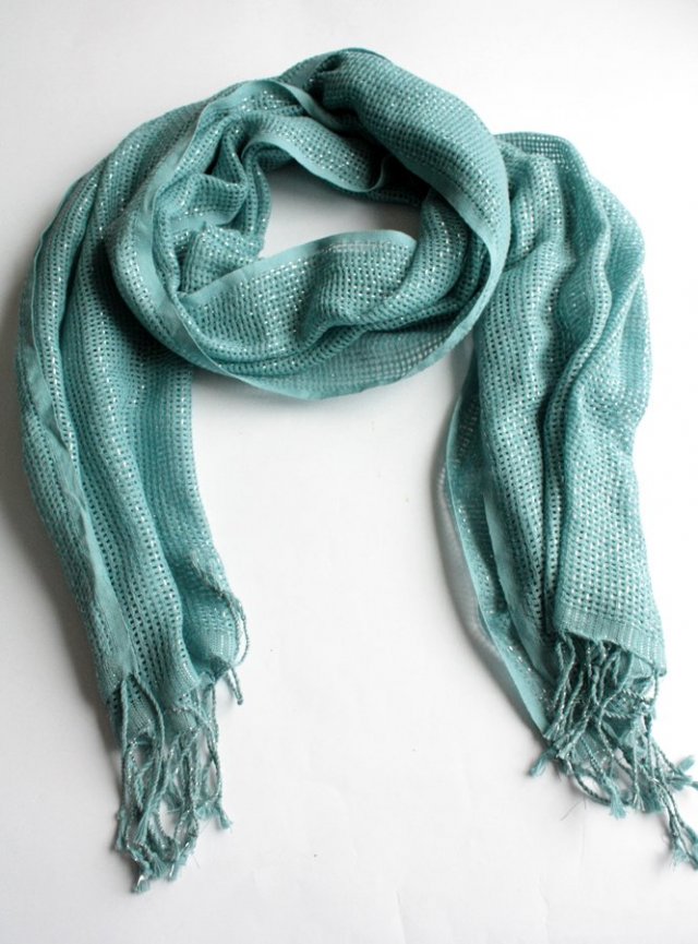 Miękki, miły w dotyku szal vintage przetykany srebrną nitką. Materiał to prawdopodobnie bawełna lub wiskoza.