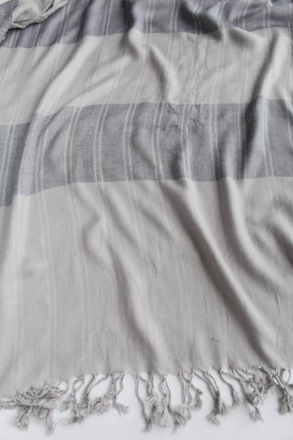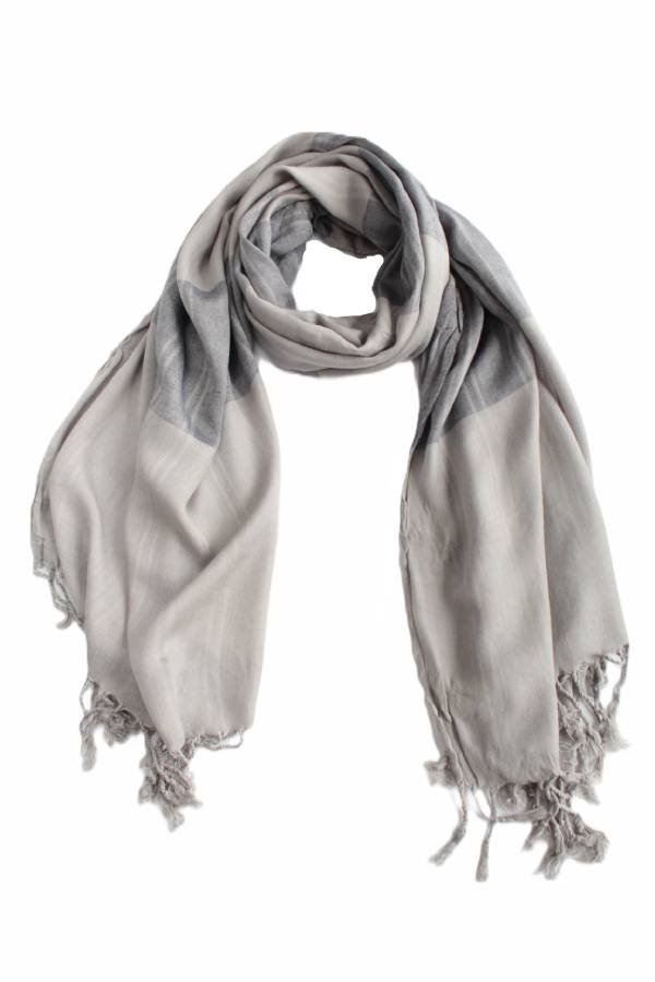 Szal vintage w odcieniach szarości, wykonany z materiału o średniej grubości. Brak metki ze składem - może to być bawełna z jedwabiem.