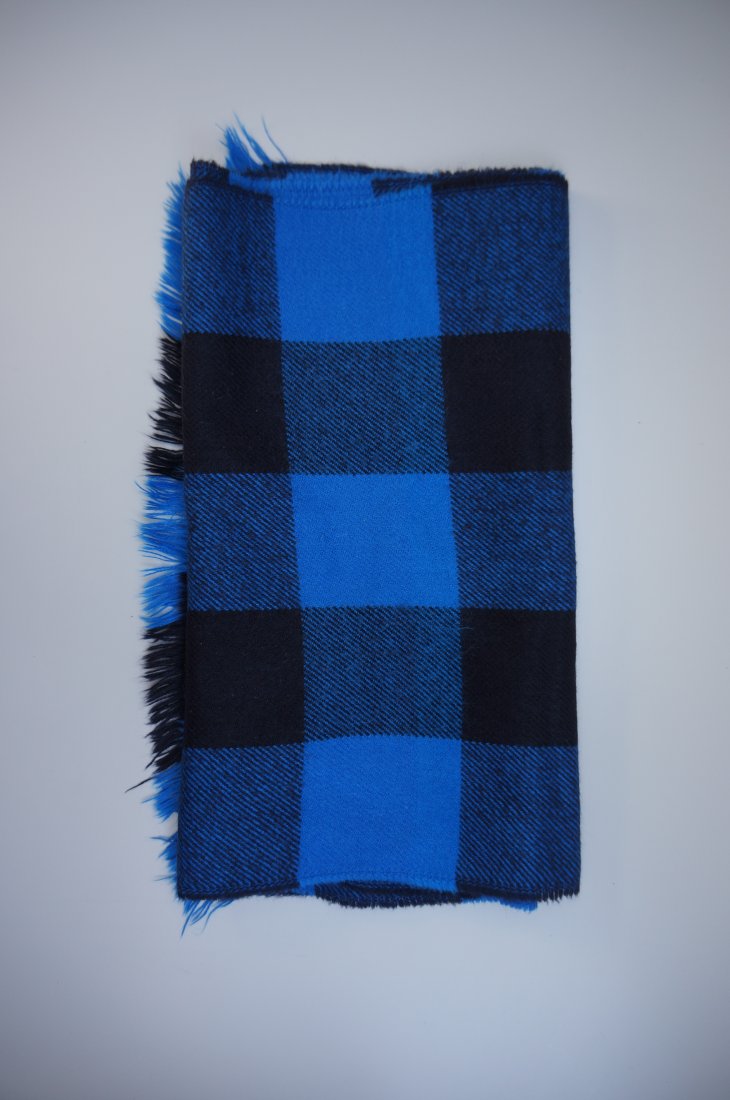 Szal w kratę czarno-niebieską. Końcówki szala wykończone krótkimi frędzlami. Stan bardzo dobry -. Bez wad.