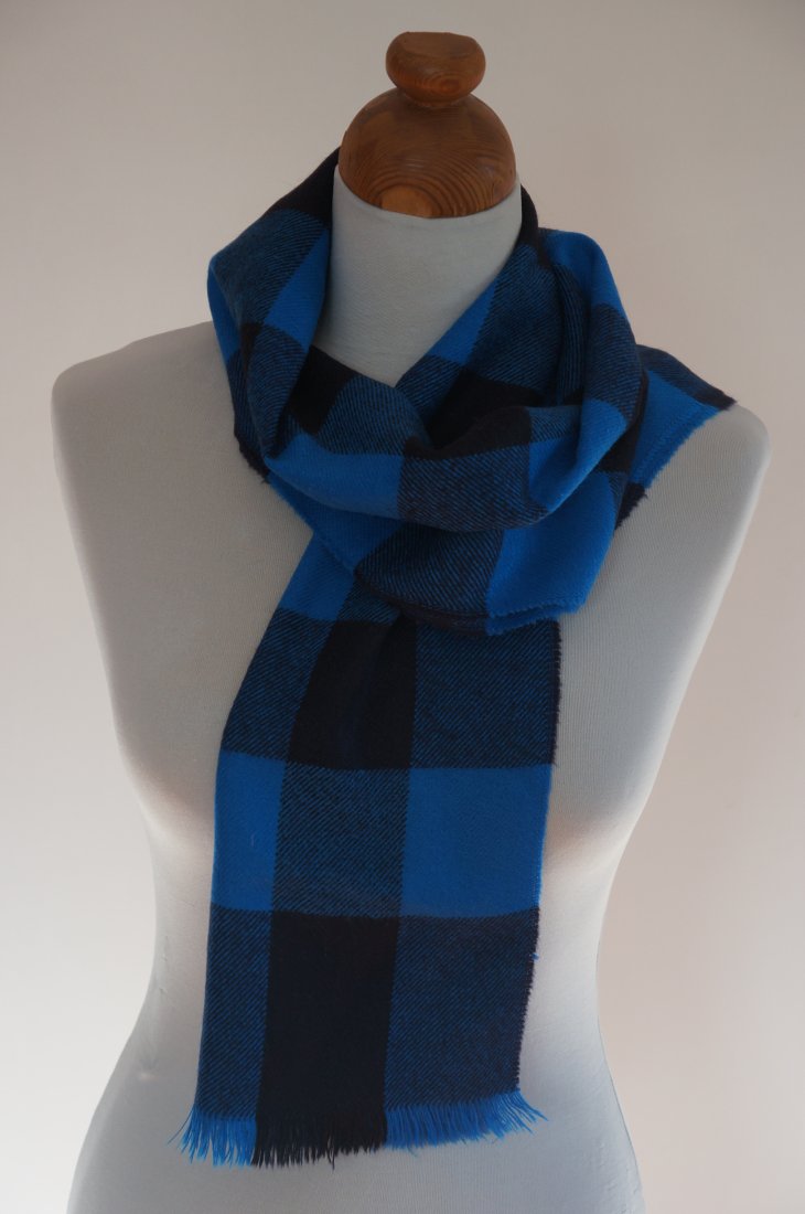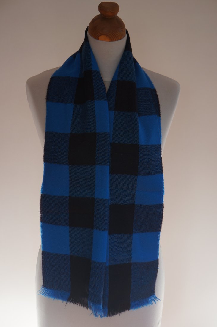 Szal w kratę czarno-niebieską. Końcówki szala wykończone krótkimi frędzlami. Stan bardzo dobry -. Bez wad.