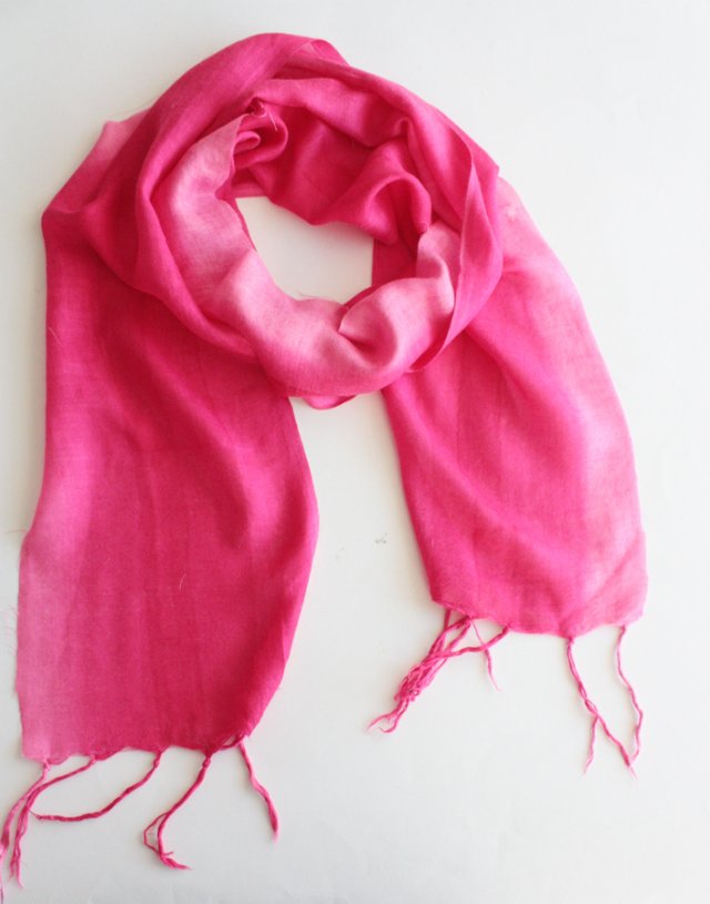 Szal w pasy w różnych odcieniach różu. Materiał to prawdopodobnie wiskoza.