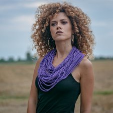 Bardzo starannie wykonany szal zapinany na 3 karabińczyki. Szal zostały wykonany z 2 warstw materiału w tym samym odcieniu fioletu. Wierzchnia strona - włoska, piękna, gruba, miękka i "włochata" wełna, spód z miłej w dotyku, gładkiej tkaniny. Szal zdobiony jest naturalną skórą oraz metalowymi zapięciami.